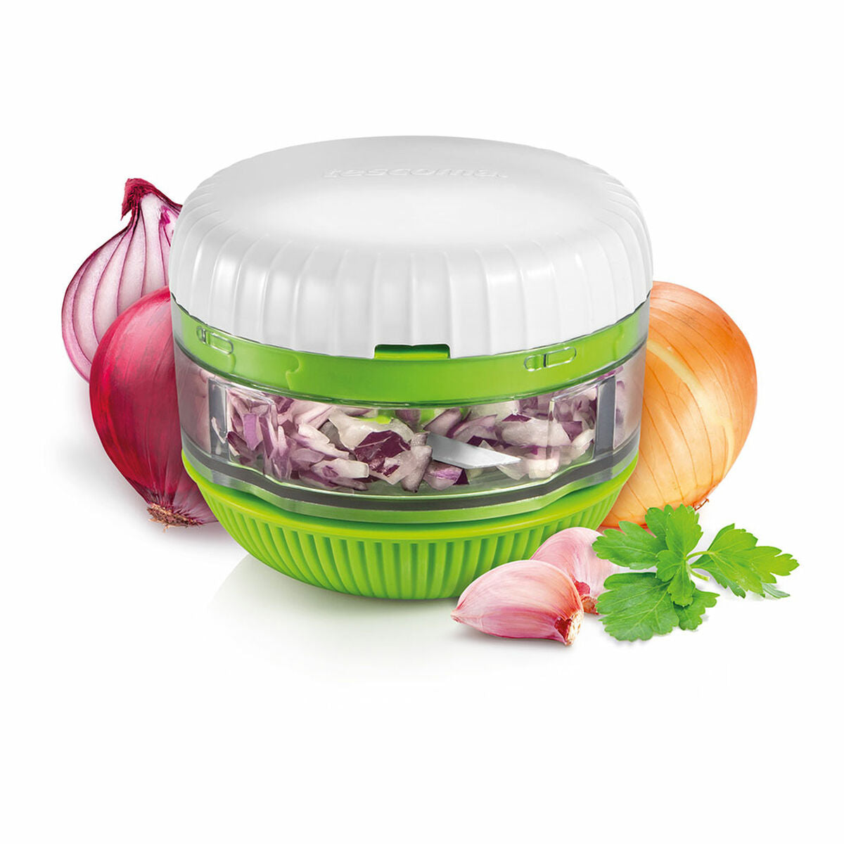 The Handy chopper by Tescoma is a practical and efficient kitchen tool designed to simplify food preparation with a rotary system that quickly and evenly chops herbs, garlic, onions, and other ingredients to the desired size. Made of durable plastic with an anti-slip finish, this chopper ensures safe and comfortable handling during use. Its high-quality stainless steel blades guarantee precise and long-lasting cutting, maintaining their sharpness even after multiple uses. Additionally, production in Spain supports a controlled and reliable manufacturing standard. The combination of its compact, functional design and distinctive green color makes it a versatile accessory suitable for any kitchen, especially for those who value speed and simplicity when preparing fresh ingredients. This product includes a 3-year warranty, reaffirming Tescoma’s confidence in its durability and quality. Overall, the Handy chopper is a sturdy and practical tool, ideal for making everyday cooking tasks easier and hassle-free.